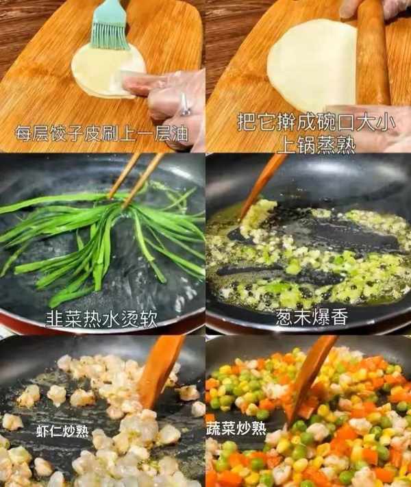 【材料】:饺子皮,韭菜,小葱,虾仁,玉米,青豆,胡萝卜,盐,鸡精,五香粉。