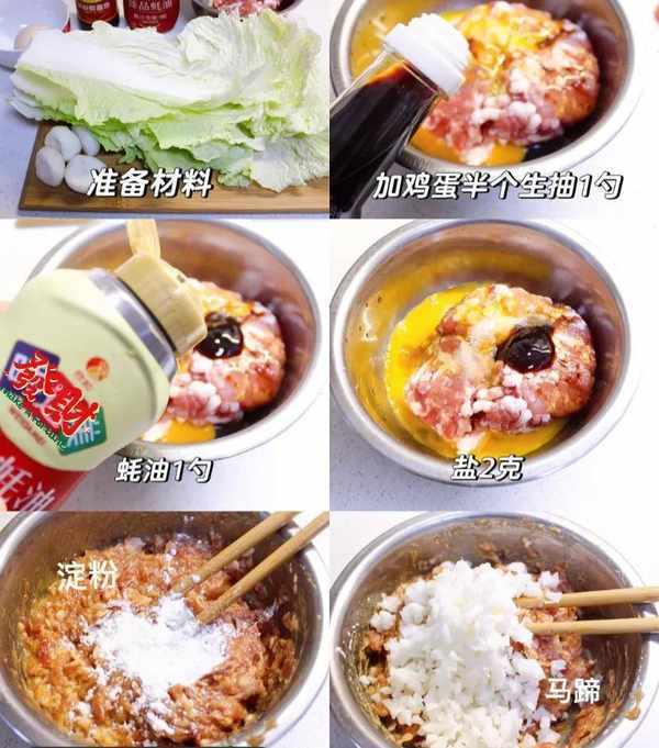 【材料】:白菜,猪肉,鸡蛋,胡萝卜,马蹄,小葱,生抽,蚝油,盐,淀粉