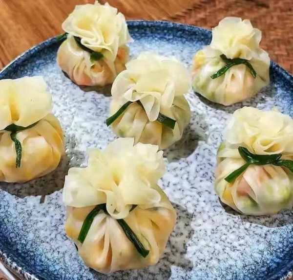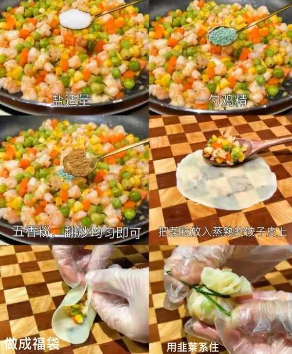 七,【五福袋】把“福禄寿喜财”全包起来,做成福袋,寓意好福气,吉祥如意。用饺子皮包入虾仁蔬菜,营养又好吃。