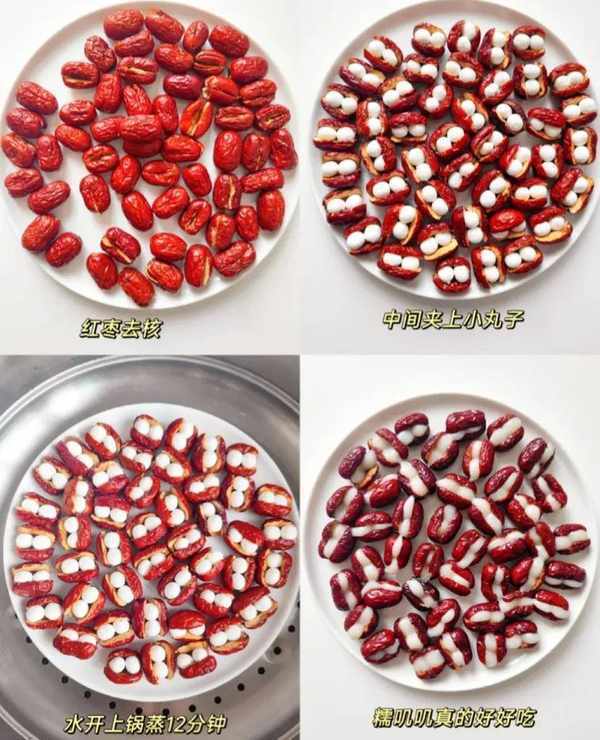 往每一粒红枣中间加入小元宵,做这一步需要有点耐心。