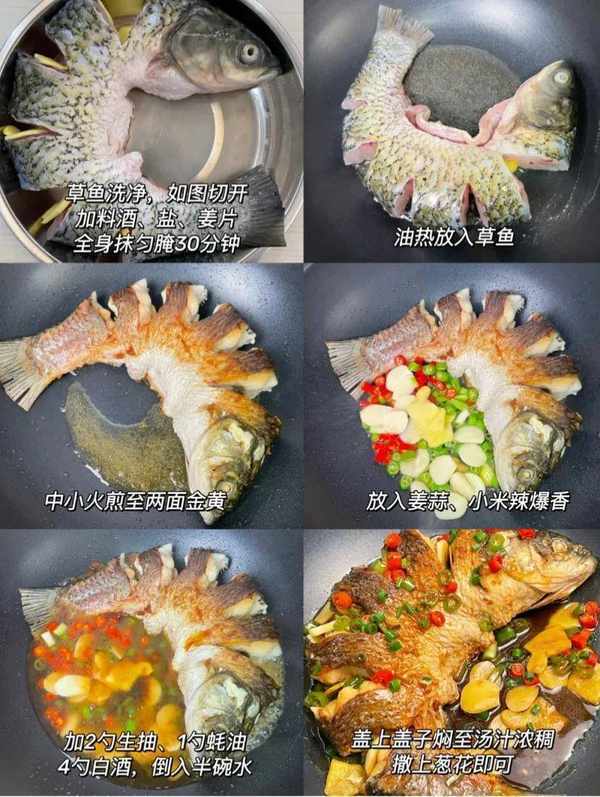 锅里倒油,油热以后放入草鱼小火慢煎,煎至两面金黄,再放入姜葱蒜,小米辣爆香,再加入两勺生抽,一勺蚝油,少量白酒,再倒上半碗水,盖上盖子,小火焖煮至汤汁浓稠,起锅再撒上小葱即可。