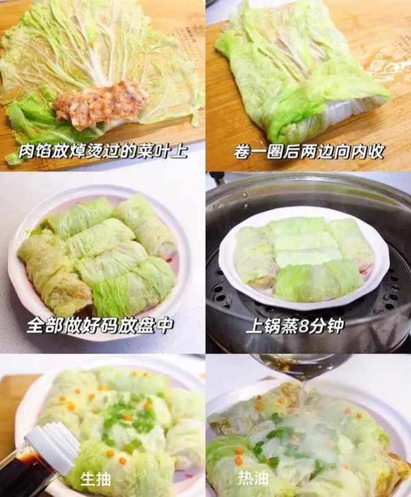 把白菜叶子下开水锅烫软,铺在刀板上,再放入肉馅,整理成长条形,白菜往里卷一圈,两边往中间折,做成枕头形状,排放在盘中。
