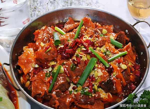 3、煮沸后加入盐;倒入煮熟的牛里脊肉,翻炒至汁液微收;出锅前淋少许酱油;麻辣牛里脊出锅配米酱;