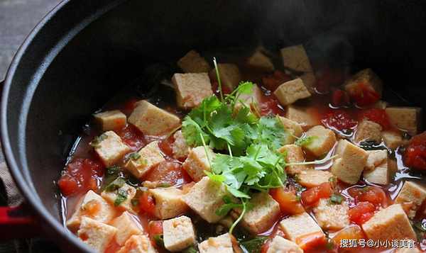 原料:冻豆腐500克左右切成小块;1个大番茄,切碎;绿叶蔬菜(甜菜、菠菜、小油菜等)适量,切片;1个小葱,切碎的葱;料酒1大汤匙;生姜适量,揉成姜末;1茶匙-1汤匙味噌酱;半茶匙米醋,不要太多,只是为了提鲜;少许白胡椒粉;适量的糖(可选);辣椒粉(可选);香菜(可省略)少许,切碎