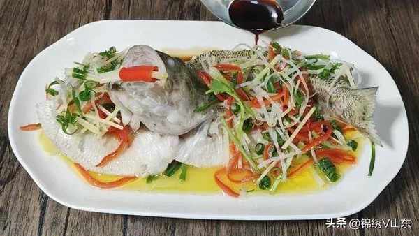 3.再起锅烧水,水烧开以后,鲈鱼上蒸锅蒸煮8分钟,然后倒掉蒸出的汁水,铺上葱丝和辣椒丝,热油爆香,最后淋上蒸鱼豉油,即可出锅开吃。