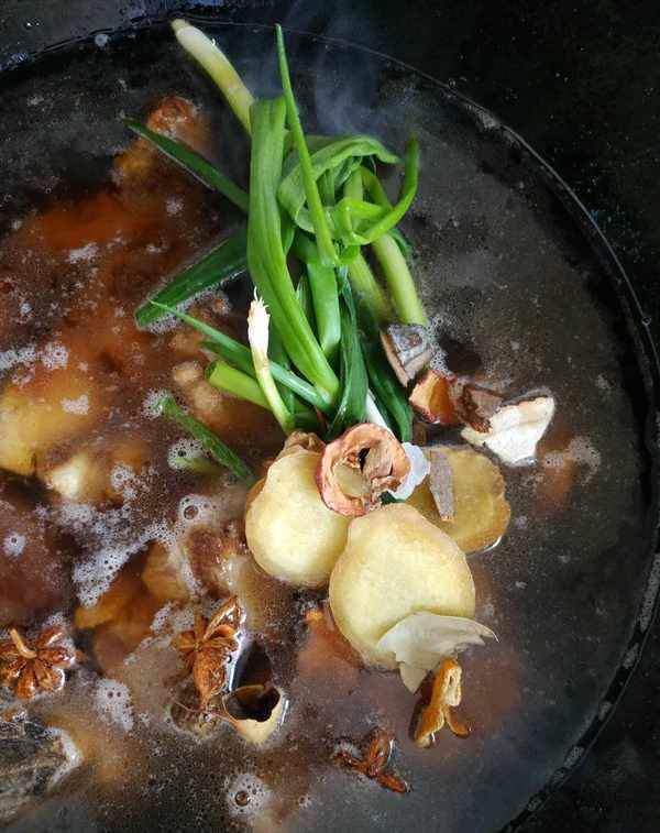 4、放入排骨,快炒至排骨均匀沾上白糖,烧热水,加入生抽、蚝油、料酒,如图,葱、八角、姜放清漆等材料。下图;大火烤,转小火煮半小时,加盐煮半小时;