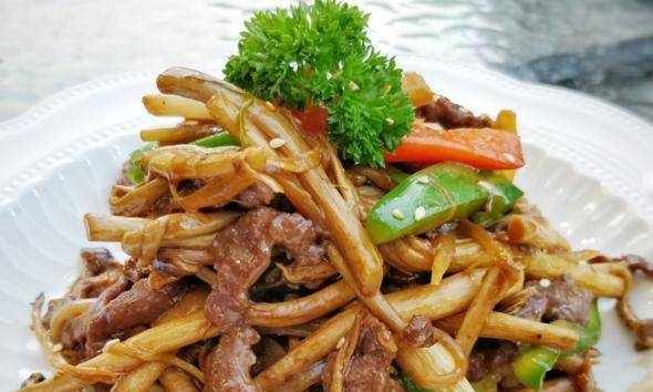 成份:茶树菇、牛肉、青椒、红椒、小葱、小葱、姜、蒜、糖、盐、蚝油、老抽、胡椒粉、料酒、生粉、酱油