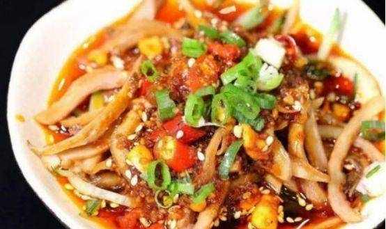 3、撒上味精、精盐、葱花、姜丝,再倒入醋和香油,拌匀即可食用。