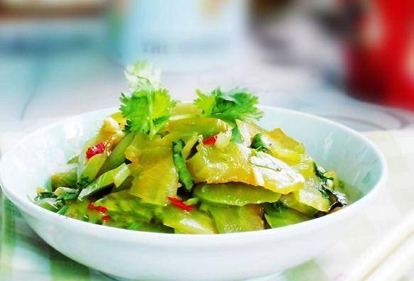 材料:苦瓜1条、香菜1条、生姜1片、番茄泥2汤匙、酱油1汤匙、醋1汤匙、灯笼椒1个