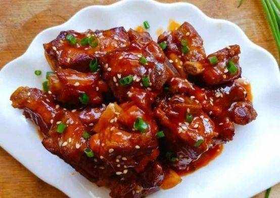 材料:排骨、姜片、葱、料酒、色拉油、老抽、生抽、白糖、白芝麻