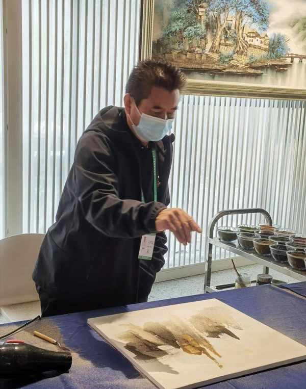 一洒、一泼、一抹……双手挥舞下,天子山御笔峰在画板上栩栩如生起来,这便是张家界的