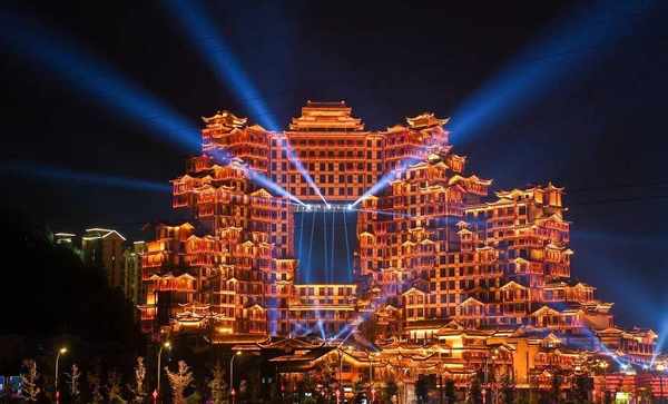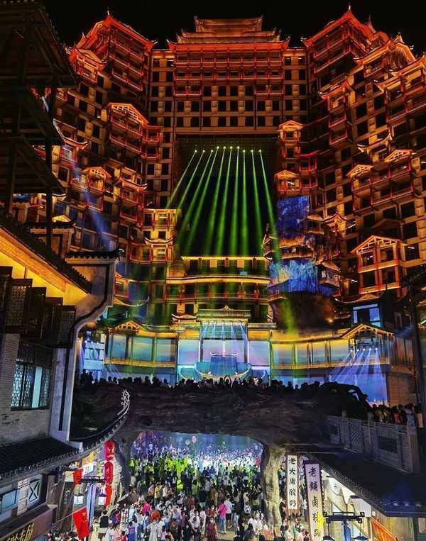 是七十二奇楼不容错过的打卡点。中心的篝火广场上人潮涌动,最前方的主楼上采用全球最新的7D全息影像,与吊脚楼集群的飞檐翘角巧妙结合,呈现出美轮美奂的主题灯光演艺。主楼中间设计的“天眼”,正对着千米之外的的天门山和天门洞。