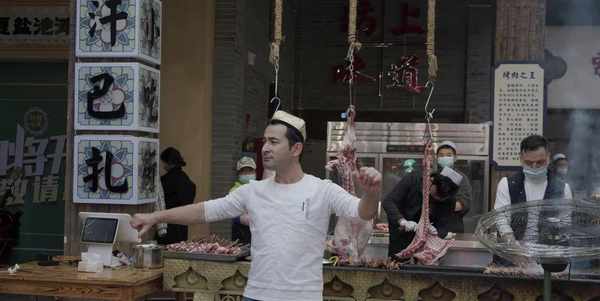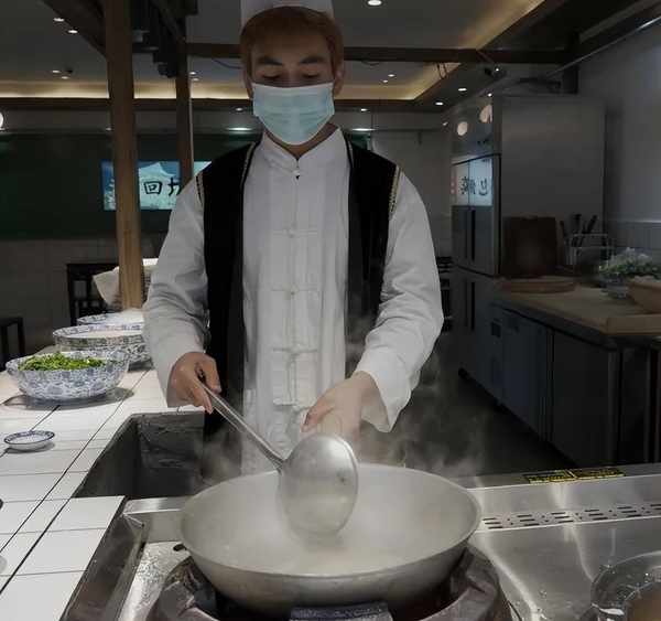 篝火广场旁的回民小吃街,可以说是“复制”了西安北院门回民街。周治湘一边介绍一边招呼往来游客免费品尝刚出锅的羊肉泡馍:“在这里能体验到正宗的清真特色小吃,我最推荐的是回坊老孙家羊肉泡馍。羊肉肉烂酥香,馍吸汁却不糊汤,泡馍粒粒分明滑美有嚼劲,吃上一口才叫不虚此行!”