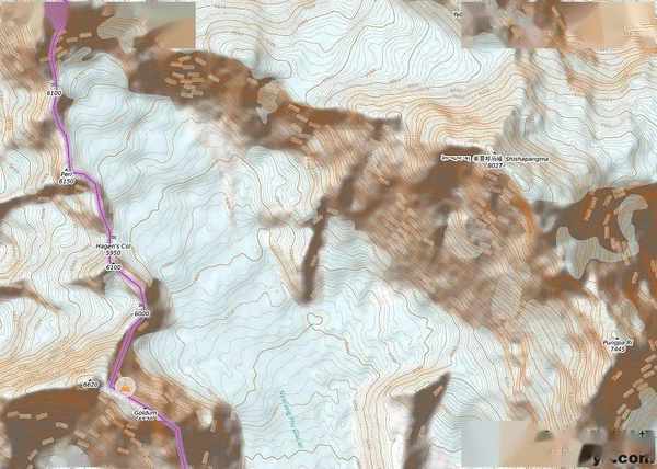 Pangri Goldumba峰,用橙色三角形标注,位于图中左侧下端,临近中国西藏自治区边境,及Goldum峰。希夏邦马峰则在地图上端右侧,地处中国境内