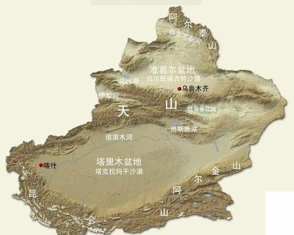 三山夹两地,三山自然就是阿尔泰山、天山和昆仑山了,两地就是准噶尔盆地和塔里木盆地,可以想象一下,有一个巨人,面朝祖国腹地,左拥右抱,拥的是准噶尔盆地,抱的是塔里木盆地,阿尔泰山和昆仑山分别是两只手臂,天山就是身体了。