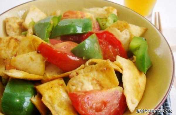 做法:1.白豆腐干洗净,切成簿片,西红柿、绿菜椒切成块。