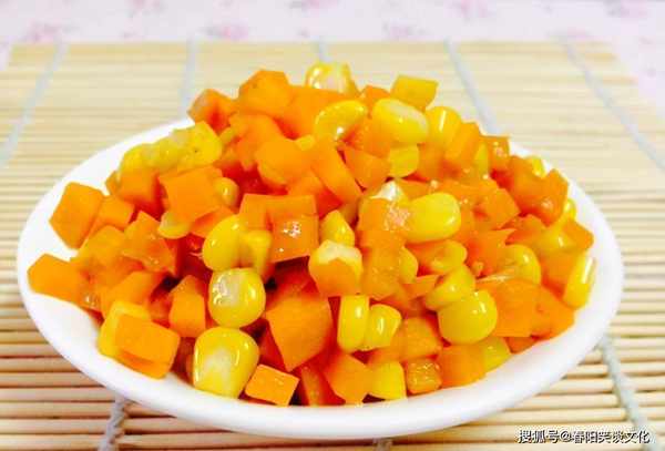 3、热锅下油,将红萝卜丁和玉米一起炒3分钟。放适量盐调味即可起锅享用