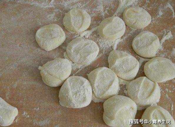 第七步:切成小块,擀成中间厚边薄的饺子皮,在饺子皮中间放上适量的馅料,捏紧包成饺子。
