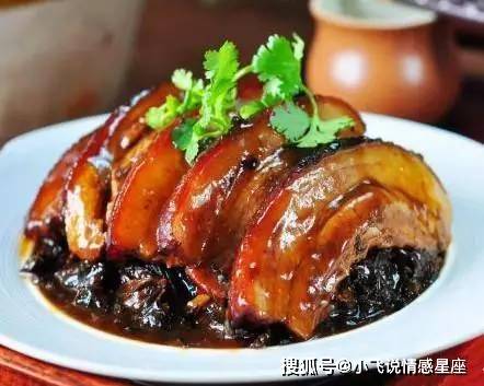 9)滤出汤汁,盛入另一个碗中待用。把腌菜和肉倒扣在盘子里,把剩下的汤勾芡,加点味精提味浇在肉上。