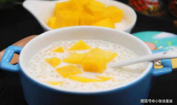 8.锅底撒上西米、冰块、芒果泥和芒果块,最后倒入冷却的椰浆就可以了。