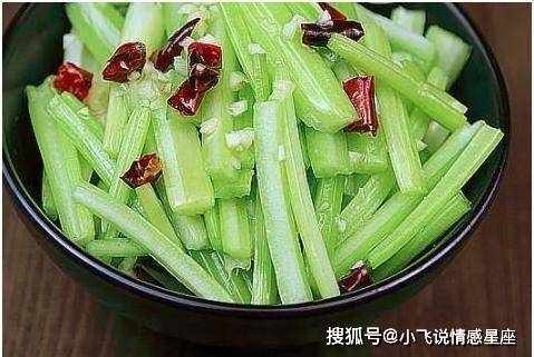 6.将一汤匙鸡精、3汤匙醋和少许香油倒入芹菜中,拌匀装盘。