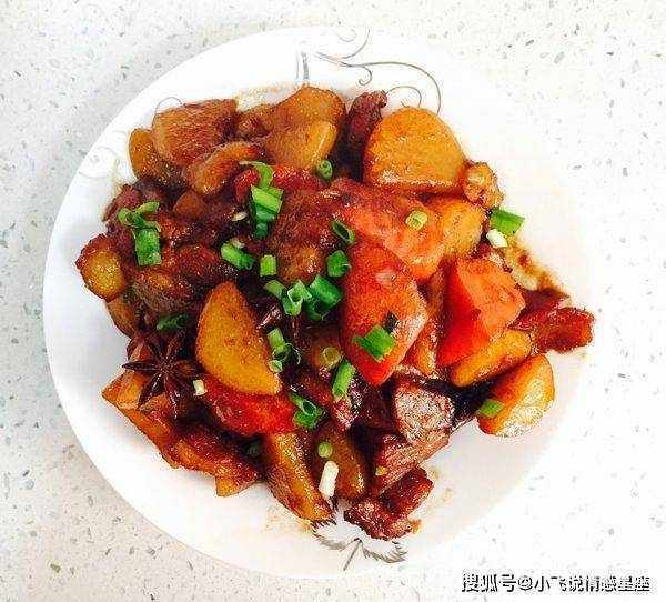 材料:肚皮300克,土豆300克,胡萝卜100克,生抽适量,老抽适量,冰糖适量,八角1个,葱花适量;