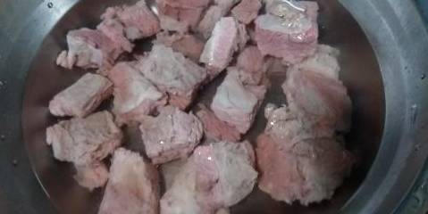 第二步,锅里煮水,与冷水一起将牛肉块放入锅里,同时放入姜片,焯水,用温水清洗血沫。