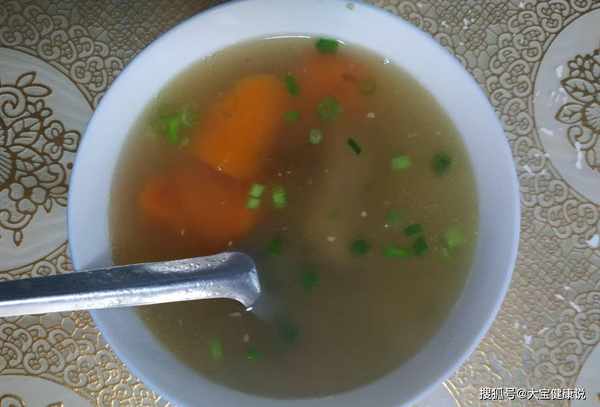 4、至此,胡萝卜排骨汤也做好了。放入碗中,加少许小葱和花椒,淋上香油趁热喝一大碗。(排骨汤下的面条也不错,我家小宝贝咬不动排骨,就给她做汤面,没想到喝了一大碗)