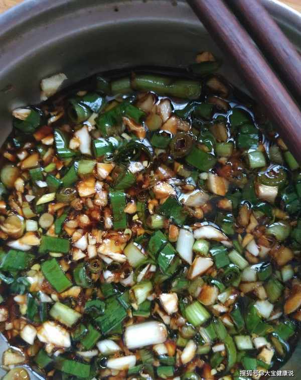 3.炖汤适合做蘸酱,(因为熬汤的时候,为了保持汤的原汁原味,更入味,没有加更多的调料,所以排骨一般都不入味,所以做个蘸酱吃排骨。趁热吃更美味)小葱、蒜、姜切碎,放入碗中,加入生抽、蚝油,拌匀,倒入热油提香,准备好了;