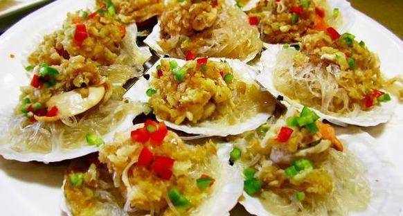 4、扇贝洗净后装盘,放上泡好的面条和炸好的蒜末,上面撒上青椒和红椒,蒸锅里的水烧开后,用大火煮青口。5分钟。