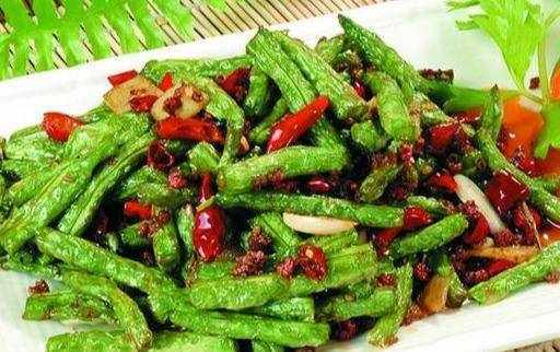 做法:1.绿豆洗净,去两端,撕去筋,沥干水分,切成长条;干辣椒切成小块,用刀拍打蒜头剁碎;磨碎生姜;2、锅中再加入少许油,大火将四季豆炒熟,炸至表皮微皱,捞出盛出,检查油量;