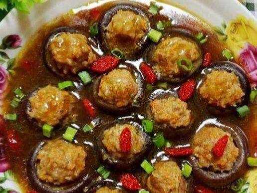 3.将肉末塞入香菇内,装盘上锅焖煮。开锅后20分钟就熟了。起锅前加入一些葱末。