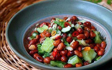 原料:花生200克,黄瓜1条,盐适量,香醋1勺,香油4滴,香菜1蒂,大蒜1头