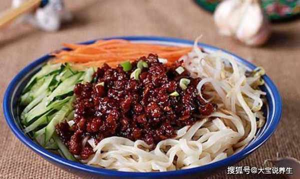 7.将准备好的蔬菜焯水,放在面条上,最后淋上炸酱。