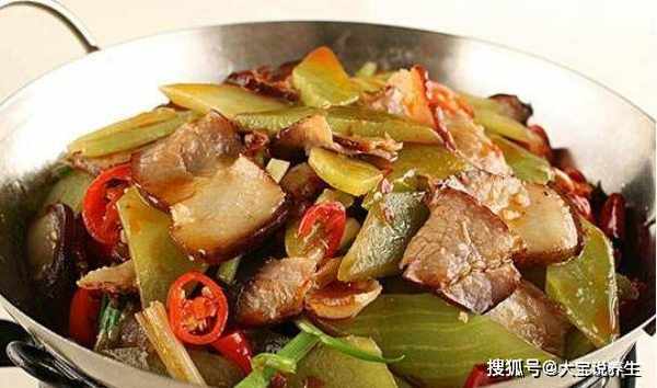 1、培根洗净,放入锅中煮10分钟左右,取出晾凉,然后切成薄片;生菜去皮斜切成半厘米厚的片;干辣椒切角,青蒜切角,姜切片待用;