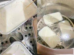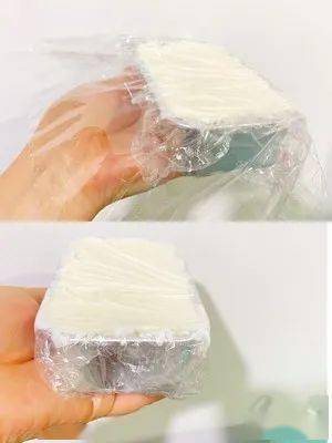 再在表面盖层保鲜膜,一定要包好哦,否则水进去了会导致年糕太湿,影响成品