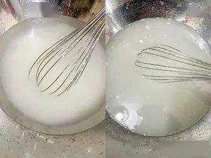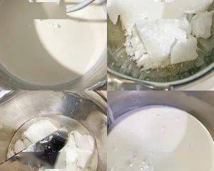 搅拌到细腻的状态后,把椰子油或黄油隔水融化,图三是还没完全融化时候拍的,不是加水哈,怕你们误解,加进去后搅拌均匀,盖上保鲜膜静置一会儿,这样大部分空气都会浮至表面