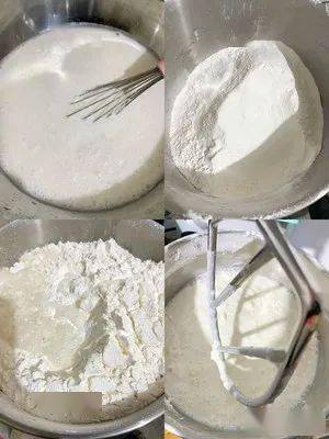 往步骤1的盆里倒入牛奶和椰浆搅拌均匀,另外准备一个盆称入所有粉类混合均匀,分次倒入液体用蛋抽搅拌均匀,做的多可以用揉面机(轻点搅拌,否则刚开始粉会乱飞刚开始可能会有颗粒感,不要着急,继续搅拌,搅拌均匀后就是非常细腻的状态了)