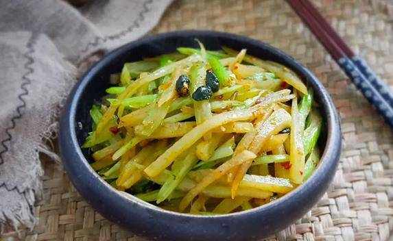 材料:芹菜2根、土豆1个、豆豉1勺、生抽1勺、盐1茶匙、姜末3克