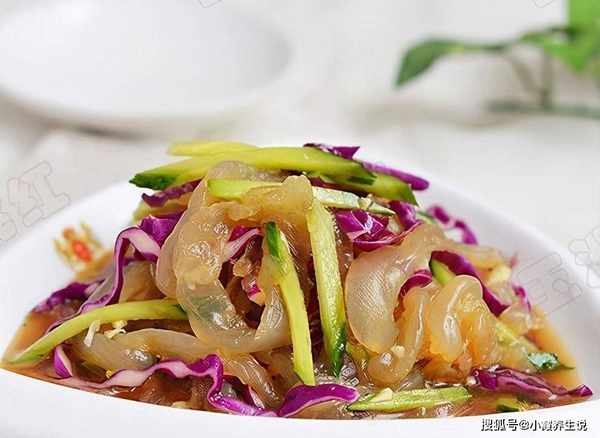 材料:海蜇250克,紫甘蓝50克,黄瓜50克,盐,生抽,橄榄油,白醋,辣椒油,蒜末
