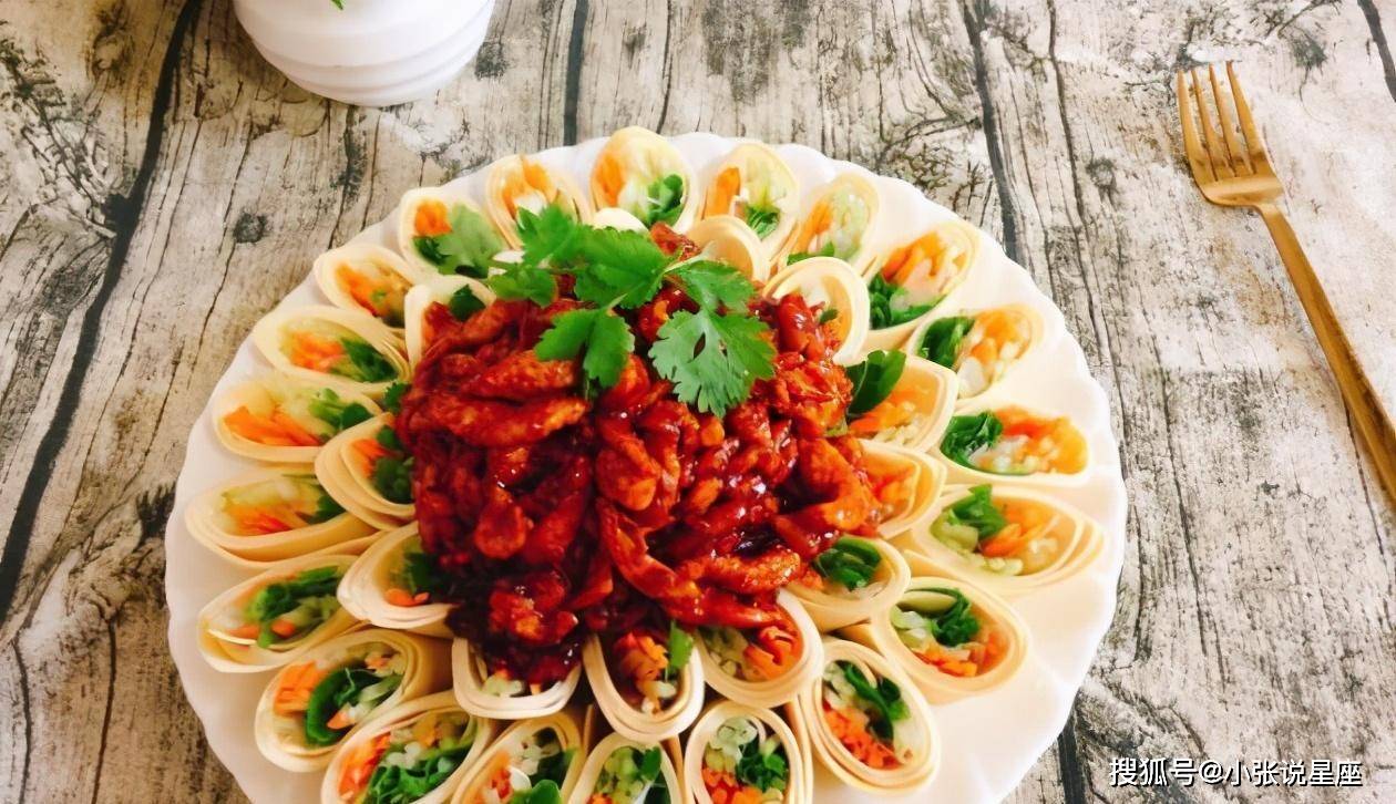材料:鸡胸肉、料酒、蛋清、生粉、油、甜面酱、蚝油、糖、豆腐、红萝卜、黄瓜、大葱、香菜