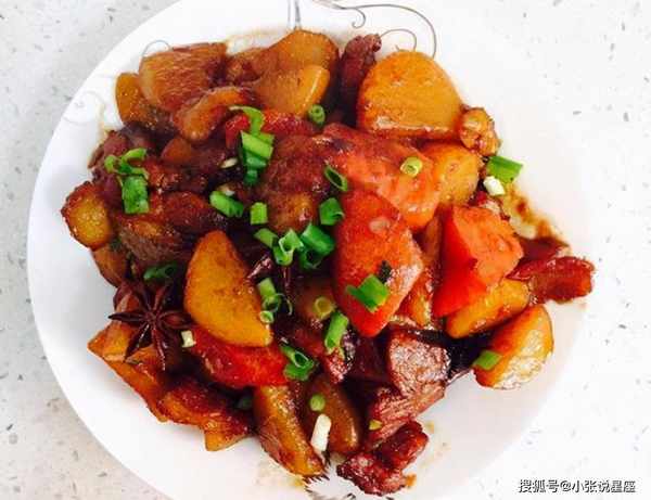 材料:五花肉300克,土豆300克,胡萝卜100克,生抽适量,老抽适量,冰糖适量,八角1个,切碎适量葱;