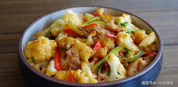 原料:猪肉100克,花菜1个,红辣椒、葱、姜、蒜;