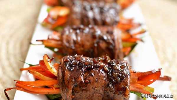 17.将炒好的蔬菜片放在牛肉卷的中央