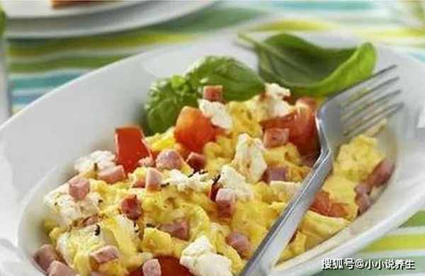1.准备材料,鸡蛋和火腿切小块。鸡蛋打匀,加少许盐