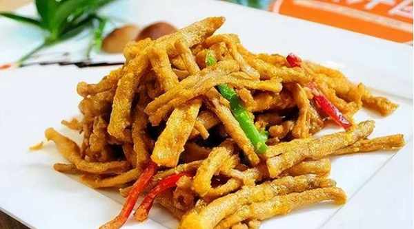 2、油锅烧热,将茶树菇放入油锅中,炸至变色后捞出;