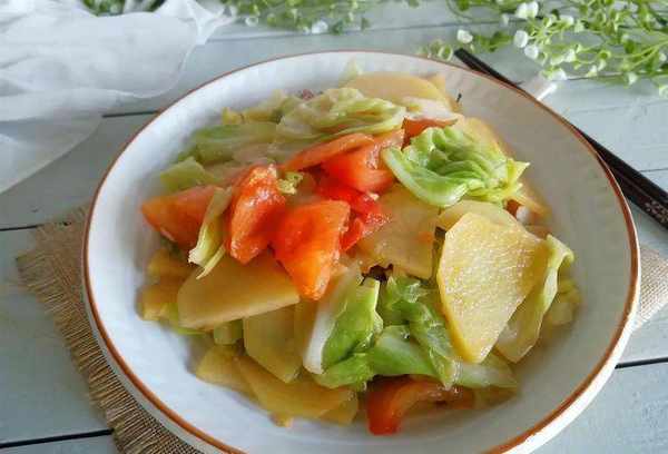 材料:白菜1/2个,土豆2个,西红柿2个,油、盐适量,葱1段,姜1片,蒜2瓣,