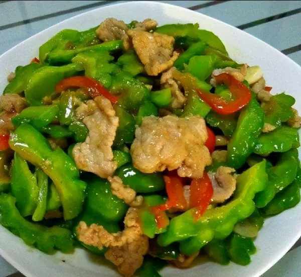 ③煎锅里的油烧热至80%热,撒上肉丝备用。锅留底油下花椒和苦瓜炒5-6分钟,撒上精盐,然后将肉丝倒入锅中搅拌均匀,加入姜丝、糖、酱油、醋和味精谷氨酸盐,上桌。盘子。