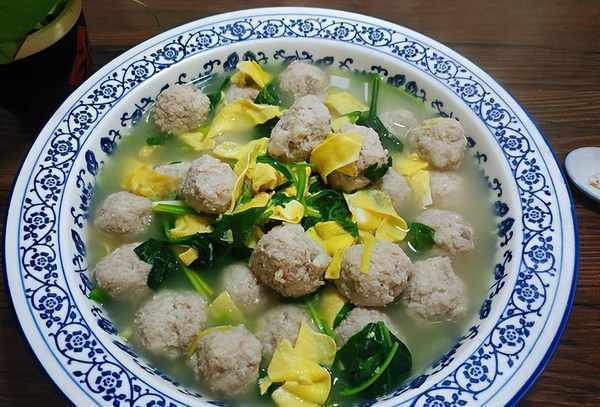 4.锅内倒入清水烧开,加入丸子再次煮开。丸子煮熟后加入菠菜韭菜蛋皮煮1分钟!