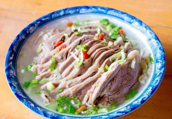 1、羊肉洗净,沥干血水,放入汤锅中煮至半熟,用直刀切成四分之三厚的薄片,盛入上菜盘中。